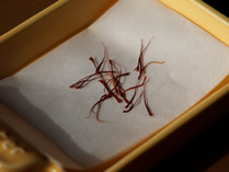 | 概説 | ヨーロッパでは古くから染料や香料として使われた、古代ギリシャでは王侯貴族のロイヤルカラーとして珍重された。 一輪から摂れる量はごくわずか。 1kgのスパイスには16万本もの花を要し、世界で最も高価なスパイスとされている 水に溶けると鮮やかな黄金色になる。 ハーブの一種 [花の雌しべ]刺激のある苦甘いハーブ。 | Summary | It was used as a dye or perfume in Europe. In Ancient Greece, it was prized as royal colour of kings and princes. One picked flower yields only small amount of saffron. In order to obtain 1 kg of saffron spices, 160,000 flowers are needed. It is regarded as the most expensive spice in the world. When put in water, the water turns bright golden color. a herb [part used:pistil]a bitter, sweet, irritative herb |