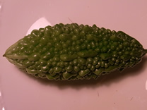 | 食用 | 苦味成分はモモルデシン.(夏バテ防止) 薄切りにして塩揉みにすると苦味が薄くなる。 ビタミンCの含有量が非常に多く、加熱調理をしても消失しないのが特徴。 若い実は塩水に浸けて苦みを抜いてからカレーに入れたり、生で食べる他、茹でたり、フライにする。 緑色が濃く鮮やかで全体の色が均一なもの。 黄色く変色しているものは避ける。 表面のイボが細かく密集していてツヤと張りがあるもの。 小ぶりのものの方が味がよい。 保存:ポリ袋にいれて冷蔵庫の野菜室へ。 半分に切ってワタを取りゆでるか、焼いてラップに包んで冷凍。 | Edible | Momordesine is responsible for the bitterness The bitterness is softened when it is cut thinly and rubbed with salt. It is very rich in vitamin C, which is destinctively not destroyed by heating. The young fruit is soaked in salted water to remove the bitterness and used in curry or eaten raw, or boiled, deep-fried. Choose ones with dark green and coloured uniformely. Yellow fruits are to be avoided. Good gourd is firm and glossy on the surface which is densely covered with small pointed edges. Smaller is better in taste. It is put in a plastic bag and placed in a refrigerator for storge. It can be frozen after cut in half and gutted, or baked and wrapped with plastic film. |