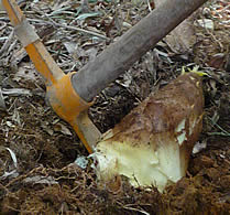 | 食用 | 掘り立ては生で食べられるが、そうでない場合は、ゆでてアク抜きが必要。 食物繊維、カリウム。 根元の赤いつぶつぶが少ない方がやわらかい。 カリウムの豊富さは野菜の中でトップクラス。 ゆでたタケノコを切ると、白い粉が出る。これは旨味の元となるチロシン。 皮に光沢があり、適度な湿り気がある。育ちすぎず、ずんぐりとしていて太く重いものがよい。切り口がみずみずしく、根元の赤い斑点が薄いものを選ぶ。 保存:米のとぎ汁でゆでて汁ごと密閉容器に入れて冷蔵庫へ。ときどき水をかえれば5日くらいはもつ。 たけのこは時間が経つほどえぐみが増しますから、入手したらすぐにゆでましょう。 ゆでるときは米のとぎ汁を使うか、ぬかを入れると、うま味はそのままでアクが抜けます。 たけのこは薄味で調理した方が風味が生きるのですが、えぐみが強いものは少し濃いめに味付けしましょう。 先端の姫皮はお吸い物などに、まん中当たりのやわらかい部分はたけのこご飯などに、それより下の硬い部分は煮物などに使います。 | Edible | Freshly harvested bamboo shoots can be eaten raw, otherwise they need to be boiled to remove harshness. They contain dietary fibers, potassium. Bamboo shoots with lesser red spots at the base are softer in texture. They boast about the high potassium content among vegetables. White powder comes out from the cut of boiled bamboo shoots. That is Tyrosine, responsible for the flavour. Bamboo shoots good for eating are moderately wet, have glossy skins, heavy, short, and not too grown. Choose the ones with fresh cut end and without the red spots at the base. [how to preserve]They are boiled in water that have been used to wash rice, and kept in a sealed container and placed in a refrigerator. They can keep for five days if the water is changed. Bamboo shoots are to be boiled soon after the harvest because the harshness increases as time passes. In order to remove the harshness without losing the flavor, bamboos are to be boiled in water which has been used to wash rice or in water with a little rice bran added. They are usually better lightly seasoned, in order to make use of the natural flavour. But when the harshness is strong, better strongly seasoned. The fine skin at the tip can be used as ingredient of broth soup, the soft parts in the middle are boiled with rice, the hard parts near the base are boiled with soy sauce. |