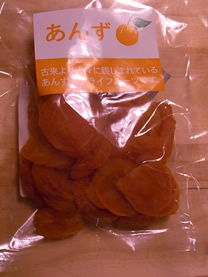 | 食用 | [実]生食。カロテン、リンゴ酸、クエン酸、ギャバ 淡いピンクの花を咲かせ、果実は初夏に熟す。 梅よりやや大きめでオレンジ色が鮮やか。 甘味は控えめで酸味の強い物が多い。 βカロテンを多く含み、100g(約2個)で一日の目標摂取量のほぼ半分を摂れる。 干しあんずにするとβカロテンが3倍以上に増える。 実は生で食べるか、乾燥、砂糖漬けにする。またジャム、ジュースにする。 ふっくらと丸みがあり、実が締まっているものがよい。 果皮全体がきれいな橙色に染まり、張りのあるものが良品。 保存:冷蔵庫の野菜室で2から3日。 熟した実は生で食べると果肉も柔らかく、甘酸っぱい味がしておいしく食べられます。 しかしあまり日持ちしないことから、多くは干しあんずに加工され、パウンドケーキなどに用いられます。果汁をリキュール種に混ぜたあんず酒は冷え性対策に役立ちます。 干しあんず:タネを取り、皮を下にして1週間ほど天日に当てて乾燥させる。 あんずジャム:火にかけたあんずは香りが増し、さやわかな酸味が美味。 | Edible | [part used:fruits]It is eaten raw, contains carotene, malic acid, citric acid, gaba. It bears pale pink flowers and the fruits ripen in early summer. The fruits are little bigger than plums and orange-coloured. The taste is lightly sweet, more often strongly sour. 100g of ansu,which is equal to 2 pcs. of fruits can satisfy almost half the daily intake level of beta carotene. The content of beta carotene tripulates when dried. The fruits are eaten raw, dried, candied, or made into confiture, juice. Choose the fruits round in shape, firm in texture, uniformly orange-coloured. [how to preserve]It lasts for a few days in a refrigerated vegetable room. Mature fruits are soft and juicy with sour and sweet taste. It is usually dried and used in sweeks like pound cakes, for it doesn't last long fresh. Apricot wine in which the juice and wine yeast are mixed has an effect on poor blood circulation. Apricots are removed of the seeds, dried under the sun for a week. Apricots increase the flavour when cooked. The jam is tasty with light acidity. |