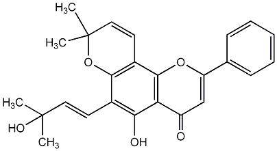 85.94 | C00004045 | Fulvinervin C (E)-5-Hydroxy-6-(3-hydroxy-3-methyl-1-butenyl)-8,8-dimethyl-2-phenyl-4H,8H-benzo[1,2-b:3,4-b']dipyran-4-one 5-Hydroxy-6-[(1E)-3-hydroxy-3-methyl-1-butenyl]-8,8-dimethyl-2-phenyl-4H,8H-benzo[1,2-b:3,4-b']dipyran-4-one |