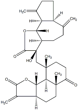 83.54 | C00012948 | Rudbeckiolide [3aR-[3aalpha,4abeta,7beta,9aalpha,10R*(3'aR*,5'S*,8'aR*,9'aR*)]]-3a,3'a,5',6',7,7',8',8'a,9,9',9a,9'a-Dodecahydro-5,5',8,8'a-tetramethyl-3-methylenespiro[4H-4a,7-ethanoazuleno[6,5-b]furan-10,3'(2'H)-naphtho[2,3-b]furan]-2,2'(3H)-dione |