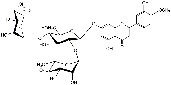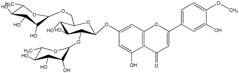 95.50 | C00013681 | Diosmetin 7-(2'',6''-dirhamnosyl)-glucoside 7-[(O-6-Deoxy-alpha-L-mannopyranosyl-(1->2)-O-[6-deoxy-alpha-L-mannopyranosyl-(1->6)]-beta-D-glucopyranosyl)oxy]-5-hydroxy-2-(3-hydroxy-4-methoxyphenyl)-4H-1-benzopyran-4-one |