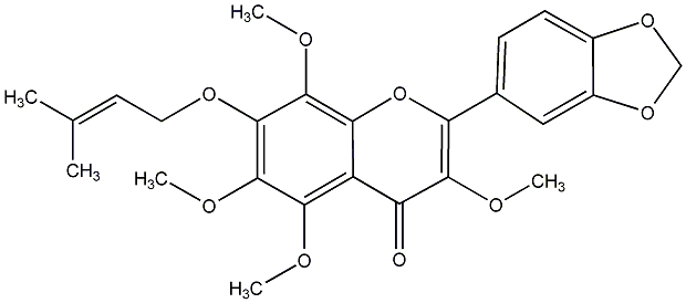 98.46 | C00005059 | 3,5,8-Trimethoxy-3',4'-methylenedioxy-7-prenyloxyflavone 2-(1,3-Benzodioxol-5-yl)-3,5,8-trimethoxy-7-[(3-methyl-2-butenyl)oxy]-4H-1-benzopyran-4-one |
