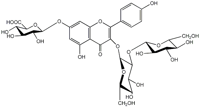 97.35 | C00005222 | Kaempferol 3-glucosyl-(1->2)-galactoside-7-glucoside 3-[(2-O-beta-D-Glucopyranosyl-beta-D-galactopyranosyl)oxy]-7-(beta-D-glucopyranosyloxy)-5-hydroxy-2-(4-hydroxyphenyl)-4H-1-benzopyran-4-one |