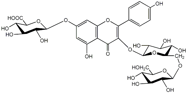 97.35 | C00005231 | Kaempferol 3-sophoroside-7-glucuronide 3-[(2-O-beta-D-Glucopyranosyl-beta-D-glucopyranosyl)oxy]-5-hydroxy-2-(4-hydroxyphenyl)-4-oxo-4H-1-benzopyran-7-yl beta-D-glucopyranosiduronic acid |