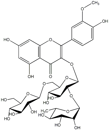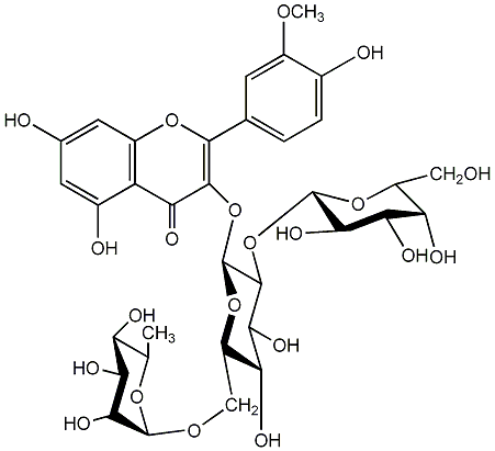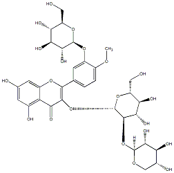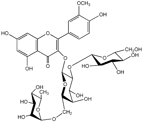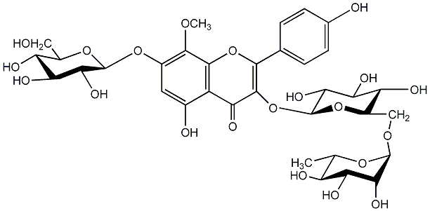 96.52 | C00013916 | Isorhamnetin 3-rhamnosyl-(1->2)-[glucosyl-(1->6)-glucoside] Quercetin 3'-methyl ether 3-rhamnosyl-(1->2)-[glucosyl-(1->6)-glucoside] 3-[(O-6-Deoxy-alpha-L-mannopyranosyl-(1->2)-O-[beta-D-glucopyranosyl-(1->6)]-beta-D-glucopyranosyl)oxy]-5,7-dihydroxy-2-(4-hydroxy-3-methoxyphenyl)-4H-1-benzopyran-4-one |