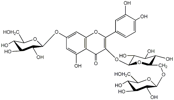 98.23 | C00005443 | Quercetin 3-rhamnosyl-(1->2)[glucosyl-(1->6)-galactoside] Quercetin 3-(6'''-rhamnosylgentiobioside) 3-[(O-6-Deoxy-alpha-L-mannopyranosyl-(1->2)-O-[beta-D-glucopyranosyl-(1->6)]-beta-D-galactopyranosyl)oxy]-2-(3,4-dihydroxyphenyl)-5,7-dihydroxy-4H-1-benzopyran-4-one |