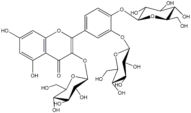 96.52 | C00005464 | Quercetin 3-sophoroside-7-glucoside 2-(3,4-Dihydroxyphenyl)-3-[(2-O-beta-D-glucopyranosyl-beta-D-glucopyranosyl)oxy]-7-(beta-D-glucopyranosyloxy)-5-hydroxy-4H-1-benzopyran-4-one Quercetin 3-sophoroside-7-glucoside2-(3,4-Dihydroxyphenyl)-3-[(2-O-beta-D-glucopyranosyl-beta-D-glucopyranosyl)oxy]-7-(beta-D-glucopyranosyloxy)-5-hydroxy-4H-1-benzopyran-4-one |