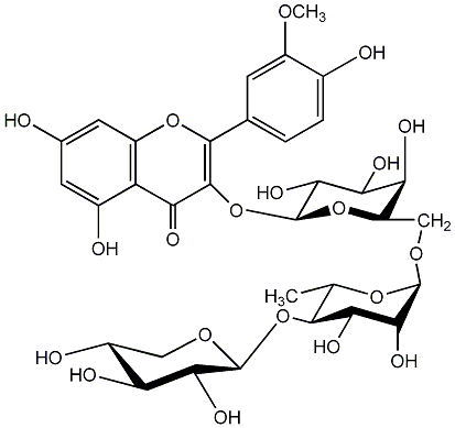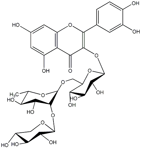 96.40 | C00005470 | Quercetin 3-neohesperidoside-7-rhamnoside 3-[[2-O-(6-Deoxy-alpha-L-mannopyranosyl)-beta-D-glucopyranosyl]oxy]-7-[(6-deoxy-alpha-L-mannopyranosyl)oxy]-2-(3,4-dihydroxyphenyl)-5-hydroxy-4H-1-benzopyran-4-one |