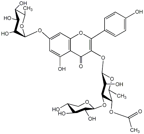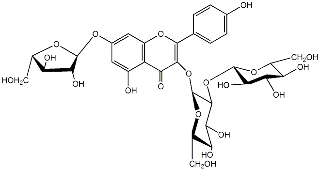 96.40 | C00013760 | Kaempferol 3-glucosyl-(1->2)-rhamnoside-7-glucoside 3-[(6-Deoxy-2-O-beta-D-glucopyranosyl-alpha-L-mannopyranosyl)oxy]-7-(beta-D-glucopyranosyloxy)-5-hydroxy-2-(4-hydroxyphenyl)-4H-1-benzopyran-4-one |