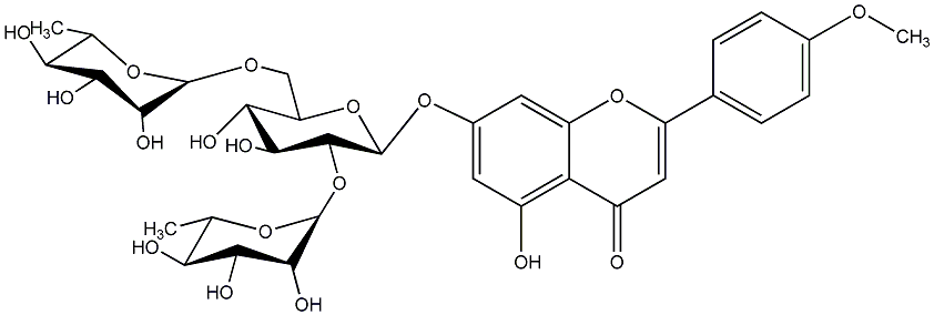 93.58 | C00013627 | Acacetin 7-(2G-rhamnosyl)-rutinoside Apigenin 4'-methyl ether 7-(2G-rhamnosyl)-rutinoside Neobudofficide 7-[(O-6-deoxy-alpha-L-mannopyranosyl-(1->2)-O-[6-deoxy-alpha-L-mannopyranosyl-(1->6)]-beta-D-glucopyranosyl]oxy)-5-hydroxy-2-(4-methoxyphenyl)-4H-1-benzopyran-4-one |