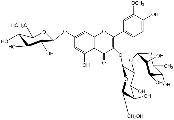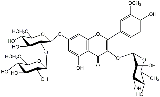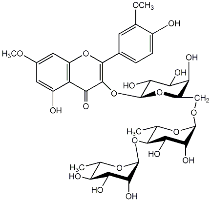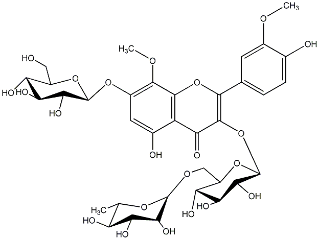 96.52 | C00013916 | Isorhamnetin 3-rhamnosyl-(1->2)-[glucosyl-(1->6)-glucoside] Quercetin 3'-methyl ether 3-rhamnosyl-(1->2)-[glucosyl-(1->6)-glucoside] 3-[(O-6-Deoxy-alpha-L-mannopyranosyl-(1->2)-O-[beta-D-glucopyranosyl-(1->6)]-beta-D-glucopyranosyl)oxy]-5,7-dihydroxy-2-(4-hydroxy-3-methoxyphenyl)-4H-1-benzopyran-4-one |