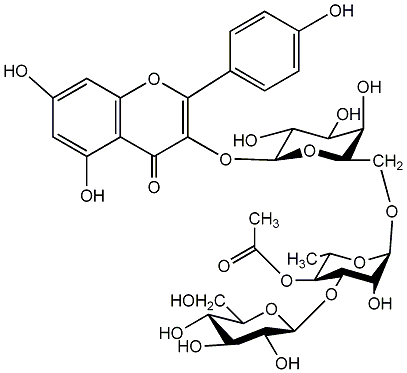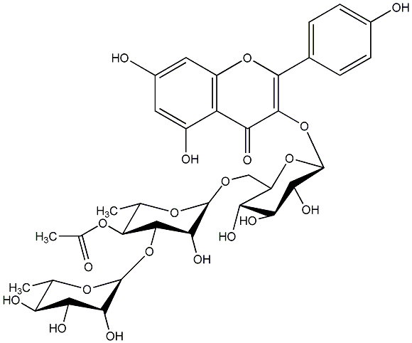 95.65 | C00013792 | Kaempferol 3-rhamnosyl-(1->3)(4'''-acetylrhamnosyl)(1->6)-glucoside 3-[(O-6-deoxy-alpha-L-mannopyranosyl-(1->3)-O-4-O-acetyl-6-deoxy-alpha-L-mannopyranosyl-(1->6)-beta-D-glucopyranosyl)oxy]-5,7-dihydroxy-2-(4-hydroxyphenyl)-4H-1-Benzopyran-4-one |