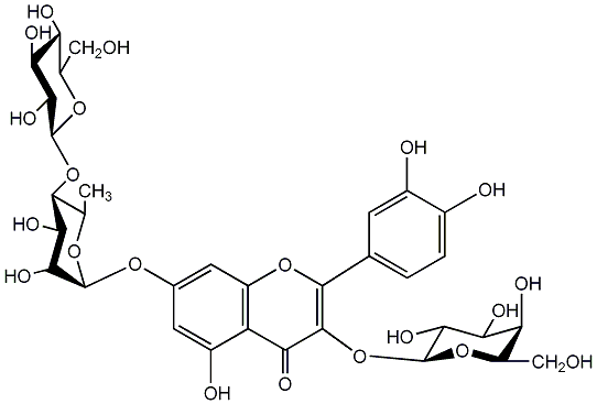 96.46 | C00005443 | Quercetin 3-rhamnosyl-(1->2)[glucosyl-(1->6)-galactoside] Quercetin 3-(6'''-rhamnosylgentiobioside) 3-[(O-6-Deoxy-alpha-L-mannopyranosyl-(1->2)-O-[beta-D-glucopyranosyl-(1->6)]-beta-D-galactopyranosyl)oxy]-2-(3,4-dihydroxyphenyl)-5,7-dihydroxy-4H-1-benzopyran-4-one |