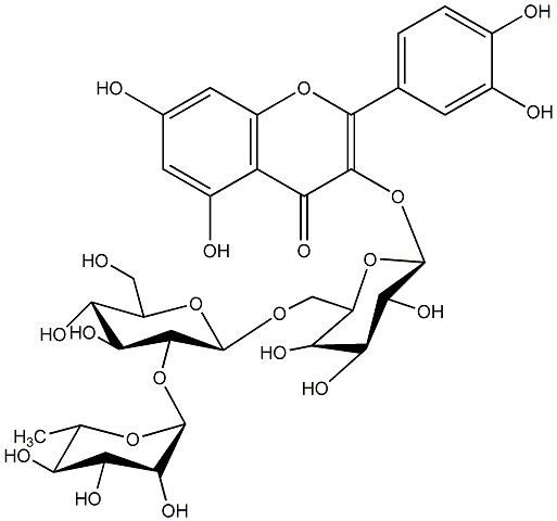 94.69 | C00013846 | Quercetin 3-rhamnosyl-(1->2)-glucosyl-(1->6)-galactoside 3-[(O-6-Deoxy-alpha-L-mannopyranosyl-(1->2)-O-beta-D-glucopyranosyl-(1->6)-beta-D-galactopyranosyl)oxy]-2-(3,4-dihydroxyphenyl)-5,7-dihydroxy-4H-1-benzopyran-4-one |