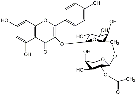 95.65 | C00005874 | Kaempferol 3-[2'''-acetyl-alpha-L-arabinopyranosyl-(1->6)-galactoside] | ![]() |