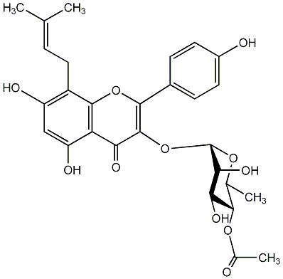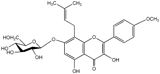 94.81 | C00005818 | Icariside II Baohuoside 1 3-[(6-Deoxy-alpha-L-mannopyranosyl)oxy]-5,7-dihydroxy-2-(4-methoxyphenyl)-8-(3-methyl-2-butenyl)-4H-1-benzopyran-4-one |