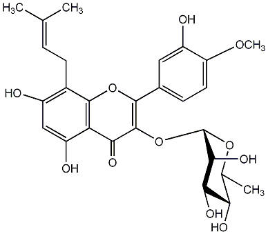 92.59 | C00005835 | 8-Prenylquercetin 4'-methyl ether 3-rhamnoside Caohuoside C 3-[(6-Deoxy-alpha-L-mannopyranosyl)oxy]-5,7-dihydroxy-2-(3-hydroxy-4-methoxyphenyl)-8-(3-methyl-2-butenyl)-4H-1-benzopyran-4-one |