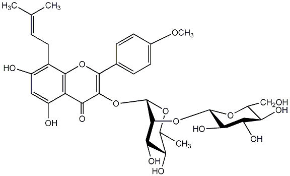 95.00 | C00014006 | Wanepimedoside A 8-(3''-Hydroxy-3''-methylbutyl)kaempferol 4'-methyl ether 3-rhamnosyl-(1->2)-rhamnoside 3-[[6-Deoxy-2-O-(6-deoxy-alpha-L-mannopyranosyl)-alpha-L-mannopyranosyl]oxy]-5,7-dihydroxy-8-(3-hydroxy-3-methylbutyl)-2-(4-methoxyphenyl)-4H-1-benzopyran-4-one |
