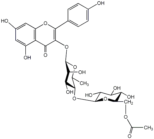 92.00 | C00013791 | Kaempferol 3-(4'',6''-diacetylglucoside)-7-rhamnoside 7-[(6-Deoxy-alpha-L-mannopyranosyl)oxy]-3-[(4,6-di-O-acetyl-beta-D-glucopyranosyl)oxy]-5-hydroxy-2-(4-hydroxyphenyl)- 4H-1-benzopyran-4-one |