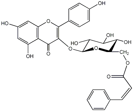 96.67 | C00013772 | Kaempferol 3-(4''-p-coumaroylglucoside) 5,7-Dihydroxy-2-(4-hydroxyphenyl)-3-[[4-O-[3-(4-hydroxyphenyl)-1-oxo-2-propenyl]-beta-D-glucopyranosyl]oxy]-4H-1-benzopyran-4-one |