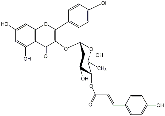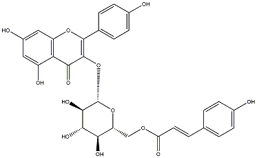 94.44 | C00005863 | Kaempferol 3-(2-(E)-p-coumarylrhamnoside) 3-[[6-Deoxy-2-O-[(2E)-3-(4-hydroxyphenyl)-1-oxo-2-propenyl]-alpha-L-mannopyranosyl]oxy]-5,7-dihydroxy-2-(4-hydroxyphenyl)-4H-1-benzopyran-4-one |