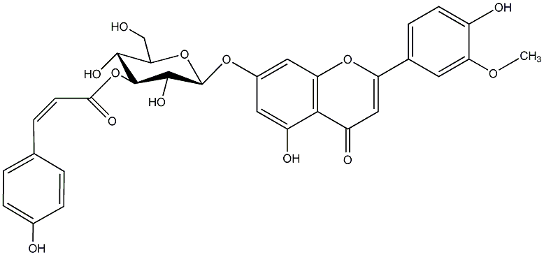 93.48 | C00013678 | Chrysoeriol 7-(3''-Z-p-coumaroylglucoside) 5-Hydroxy-2-(4-hydroxy-3-methoxyphenyl)-7-[[3-O-[(2Z)-3-(4-hydroxyphenyl)-1-oxo-2-propenyl]-beta-D-glucopyranosyl]oxy]-4H-1-benzopyran-4-one |