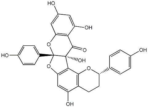 94.25 | C00014710 | [2R-[2alpha,3beta(R*)]]-3-[2,3-Dihydro-2,4,6-trihydroxy-2-[(4-hydroxyphenyl)methyl]-3-oxo-7-benzofuranyl]-2,3-dihydro-5,7-dihydroxy-2-(4-hydroxyphenyl)-4H-1-benzopyran-4-one | ![]() |