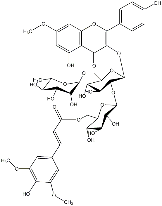 94.29 | C00013817 | Kaempferol 7-methyl ether 3-(6-(E)-3,5-dimethoxy-4-hydroxycinnamoylglucosyl)-(1->2)-[rhamnosyl-(1->6)-glucoside] 3-[[O-6-Deoxy-alpha-L-mannopyranosyl-(1->6)-O-[6-O-[(2E)-3-(4-hydroxy-3,5-dimethoxyphenyl)-1-oxo-2-propenyl]-beta-D-glucopyranosyl-(1->2)]-beta-D-glucopyranosyl]oxy]-5-hydroxy-2-(4-hydroxyphenyl)-7-methoxy-4H-1-benzopyran-4-one |