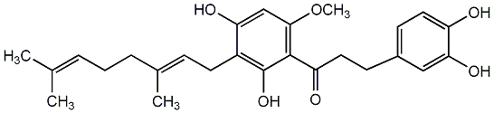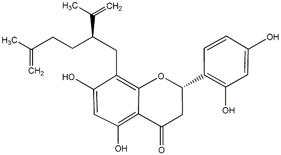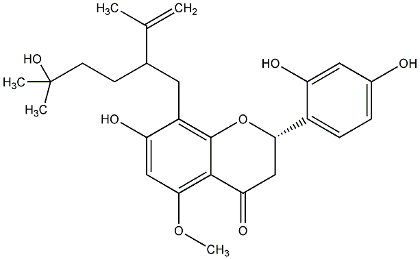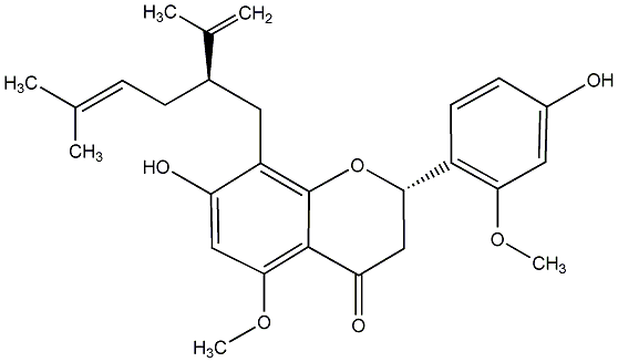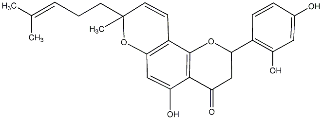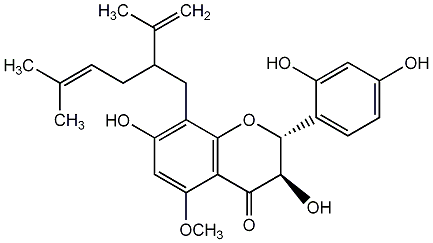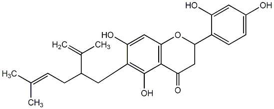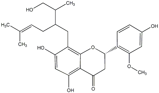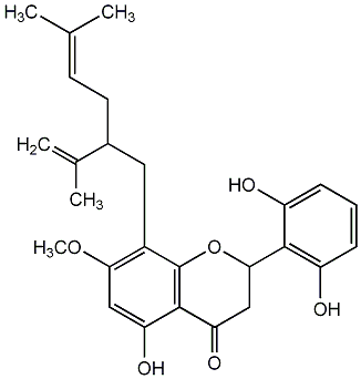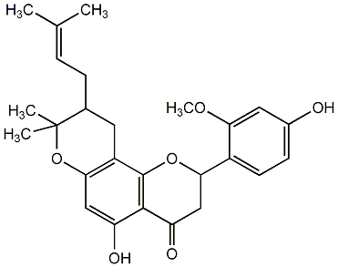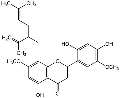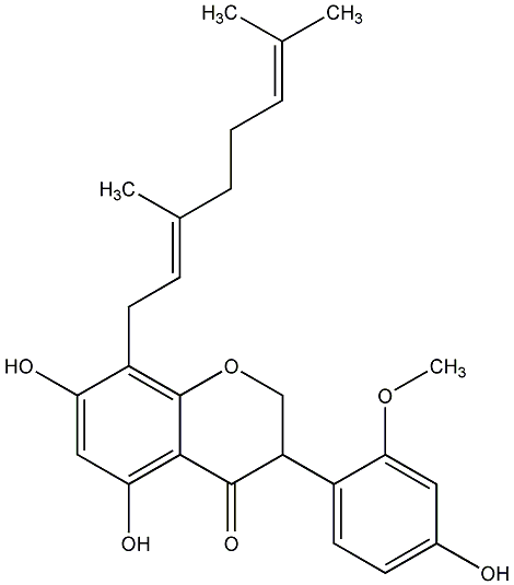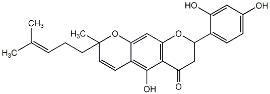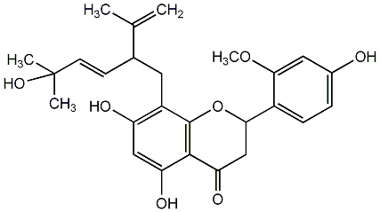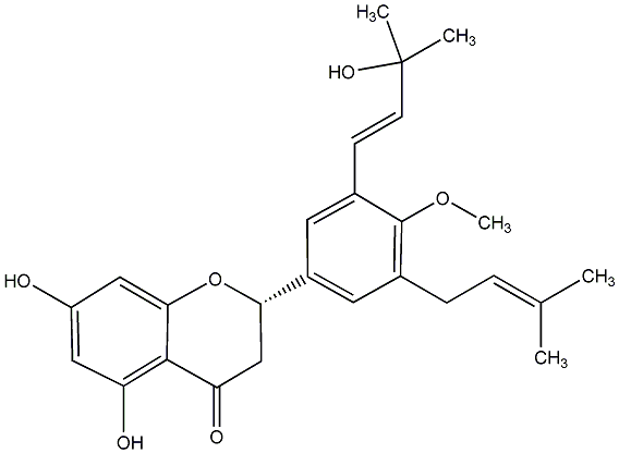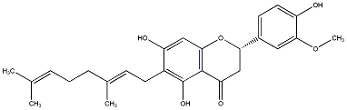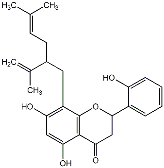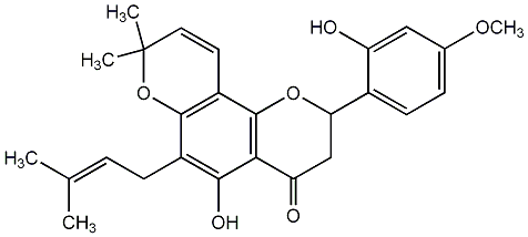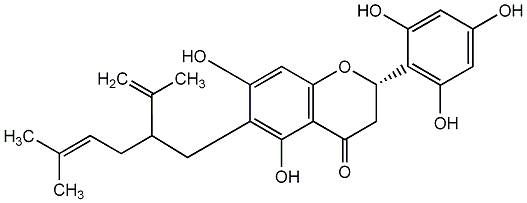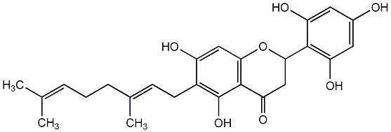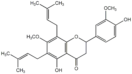 91.04 | C00008469 | Hiravanone (S)-2,3-Dihydro-5,7-dihydroxy-2-(4-hydroxy-3-methoxyphenyl)-6,8-bis(3-methyl-2-butenyl)-4H-1-benzopyran-4-one |