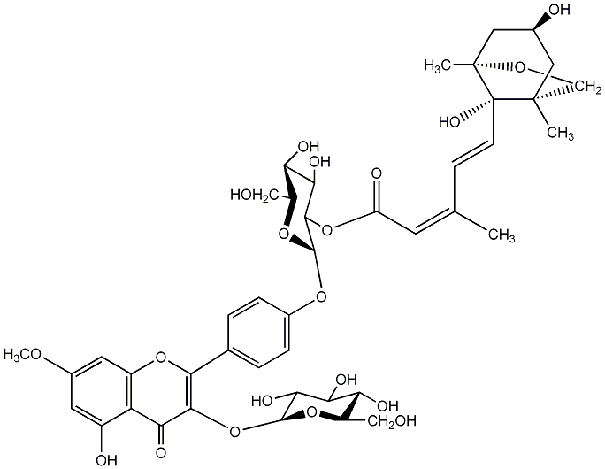 84.44 | C00013799 | Kaempferol 3-glucosyl-(1->2)-rhamnoside-7-(6''-(E)-p-coumaroylglucoside) 3-[(6-Deoxy-2-O-beta-D-glucopyranosyl-alpha-L-mannopyranosyl)oxy]-5-hydroxy-2-(4-hydroxyphenyl)-7-[[6-O-[(2E)-3-(4-hydroxyphenyl)-1-oxo-2-propenyl]-beta-D-glucopyranosyl]oxy]-4H-1-benzopyran-4-one |