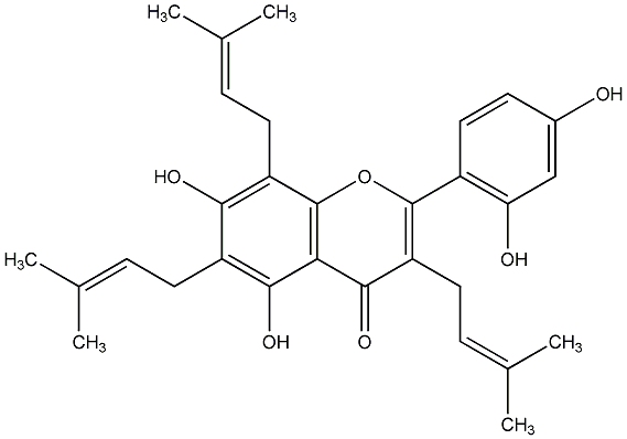 87.01 | C00013416 | Dorsilurin D (+)-2-(2,4-Dihydroxyphenyl)-5,7-dihydroxy-8-(2-hydroxy-3-methyl-3-butenyl)-3,6-bis(3-methyl-2-butenyl)-4H-1-benzopyran-4-one |