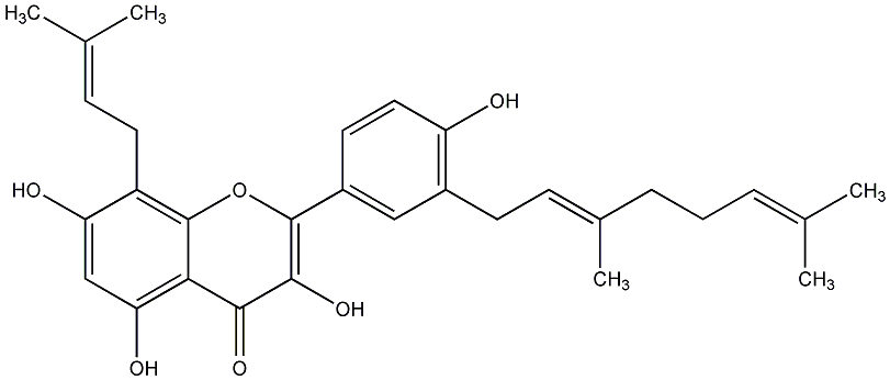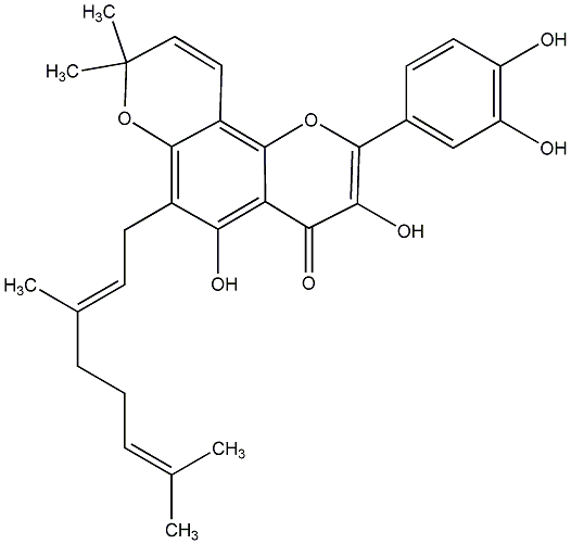 | C00013540 | Dorsmanin C 2-(3,4-Dihydroxyphenyl)-6-[(2E)-3,7-dimethyl-2,6-octadienyl]-3,5-dihydroxy-8,8-dimethyl-4H,8H-benzo[1,2-b:3,4-b']dipyran-4-one |