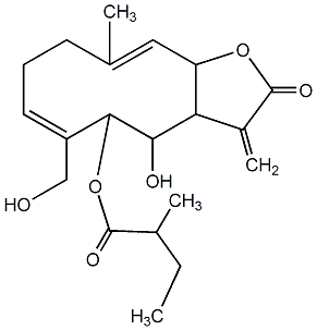 96.08 | C00011859 | (3aR,4R,6E,10Z,11aR)-6-Formyl-2,3,3a,4,5,8,9,11a-octahydro-10-(hydroxymethyl)-3-methylene-2-oxocyclodeca[b]furan-4-yl ester 2-methylbutanoic acid | ![]() |