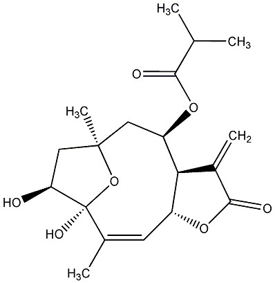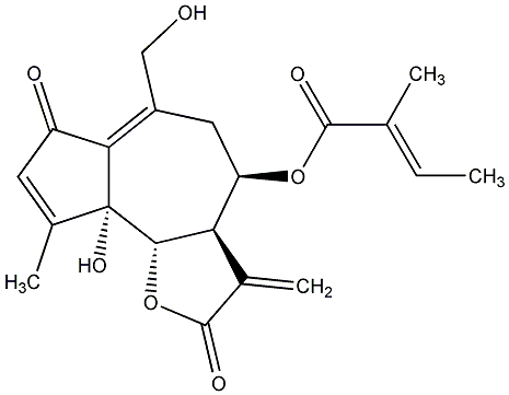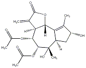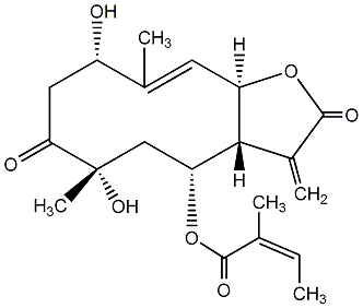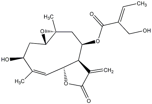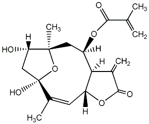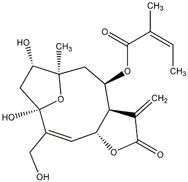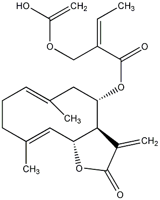 91.23 | C00012316 | [3aS-[3aR*,4R*(Z),5R*,6R*,10E,11aS*]]-2,3,3a,4,5,6,7,8,9,11a-Decahydro-5,6-dihydroxy-6,10-dimethyl-3-methylene-2,7-dioxocyclodeca[b]furan-4-yl ester 2-methyl-2-butenoic acid | ![]() |