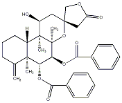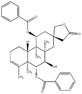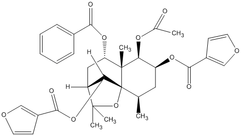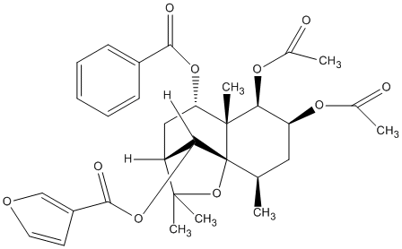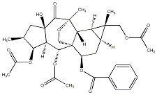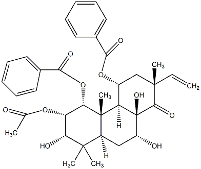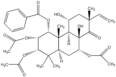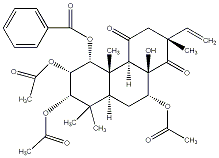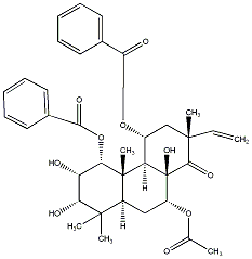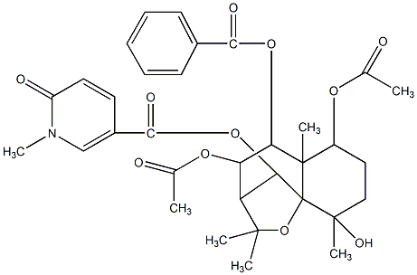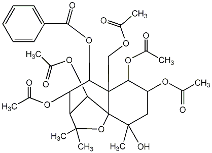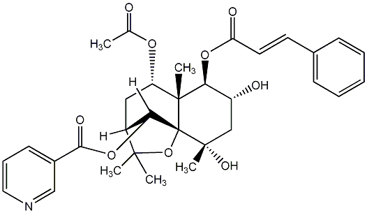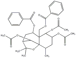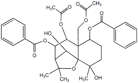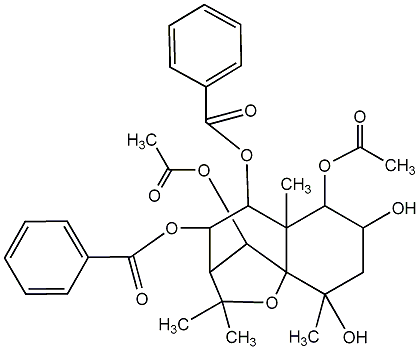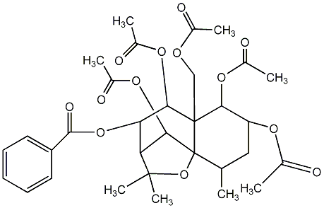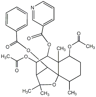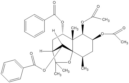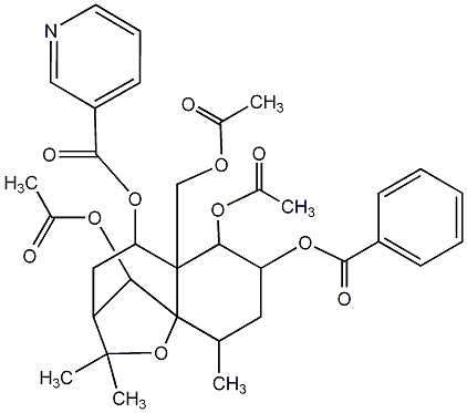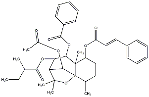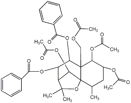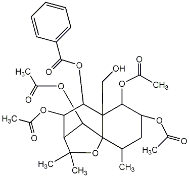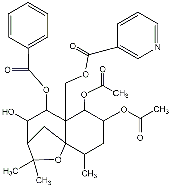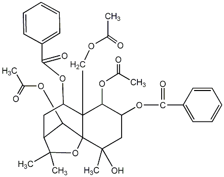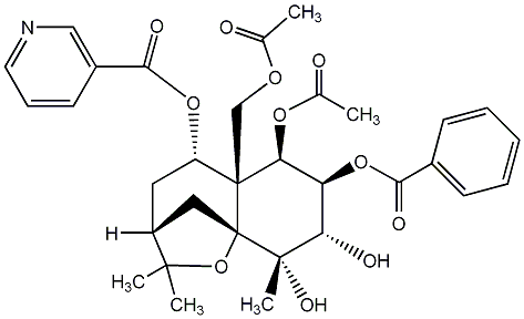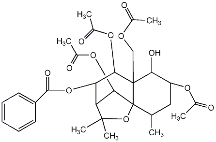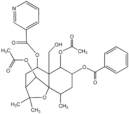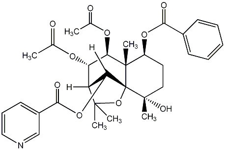 90.32 | C00013169 | [3R-(3alpha,4beta,5alpha,5aalpha,6alpha,9beta,9aalpha,10R*)]-4,5-bis(Acetyloxy)-6-(benzoyloxy)octahydro-9-hydroxy-2,2,5a,9-tetramethyl-2H-3,9a-methano-1-benzoxepin-10-yl ester 3-pyridinecarboxylic acid | ![]() |