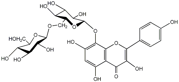 96.74 | C00013740 | Kaempferol 7-sophoroside 7-[(2-O-beta-D-Glucopyranosyl-beta-D-glucopyranosyl)oxy]-3,5-dihydroxy-2-(4-hydroxyphenyl)-4H-1-benzopyran-4-one |