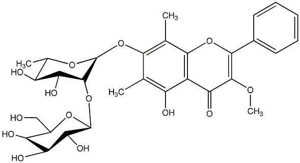 95.65 | C00014009 | 5,7-Dihydroxy-6,8-di-C-methyl-3-methyoxflavone 7-galactosyl-(1->2)-rhamnoside 7-[(6-Deoxy-2-O-beta-D-galactopyranosyl-alpha-L-mannopyranosyl)oxy]-5-hydroxy-3-methoxy-6,8-dimethyl-2-phenyl-4H-1-benzopyran-4-one |