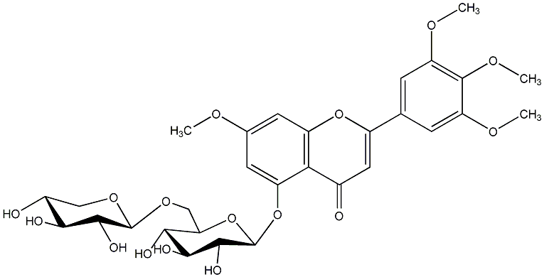 | C00013722 | Lethedioside B Tricetin 7,3',4',5'-trimethyl eter 5-xylosyl-(1->6)-glucoside 7-Methoxy-2-(3,4,5-trimethoxyphenyl)-5-[(6-O-beta-D-xylopyranosyl-beta-D-glucopyranosyl)oxy]-4H-1-benzopyran-4-one |
