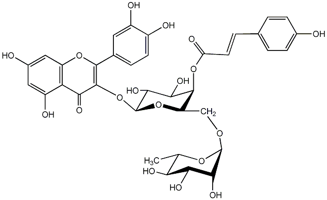 97.30 | C00013874 | Quercetin 3-(2G-(E)-p-coumaroylrutinoside) 3-[[6-O-(6-Deoxy-alpha-L-mannopyranosyl)-2-O-[(2E)-3-(4-hydroxyphenyl)-1-oxo-2-propenyl]-beta-D-glucopyranosyl]oxy]-2-(3,4-dihydroxyphenyl)-5,7-dihydroxy-4H-1-benzopyran-4-one |