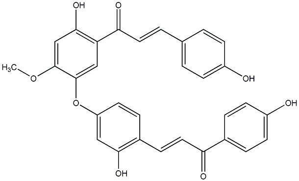 93.67 | C00014520 | Rhuschalcone IV (2E)- 3-[2-Hydroxy-4-[4-hydroxy-5-[(2E)-3-(4-hydroxyphenyl)-1-oxo-2-propenyl]-2-methoxyphenoxy]phenyl]-1-(4-hydroxyphenyl)-2-propen-1-one |