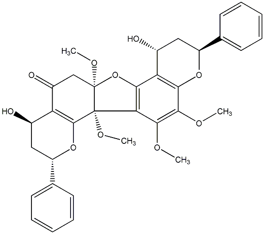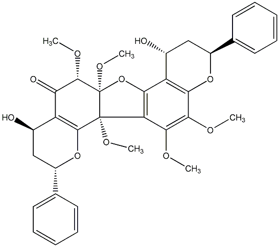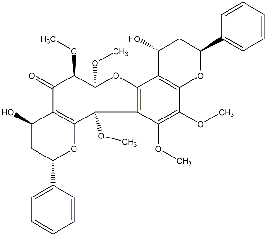 90.00 | C00013563 | Calycopterone (2R,7aS,11R,13S,14aR)-rel-(-)-2,3,12,13-Tetrahydro-8-hydroxy-6,7,7a,9,13-pentamethoxy-2,11-diphenyl-11H-furo[2,3-f:4,5-i']bis[1]benzopyran-5(7aH)-one |