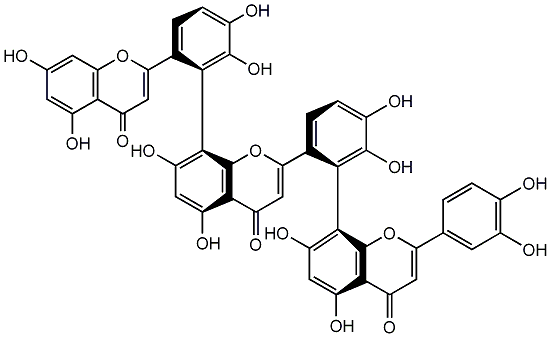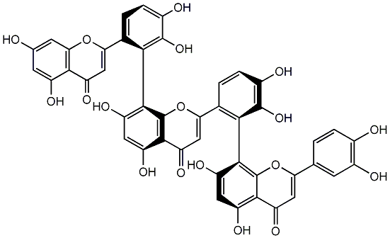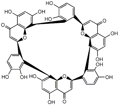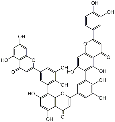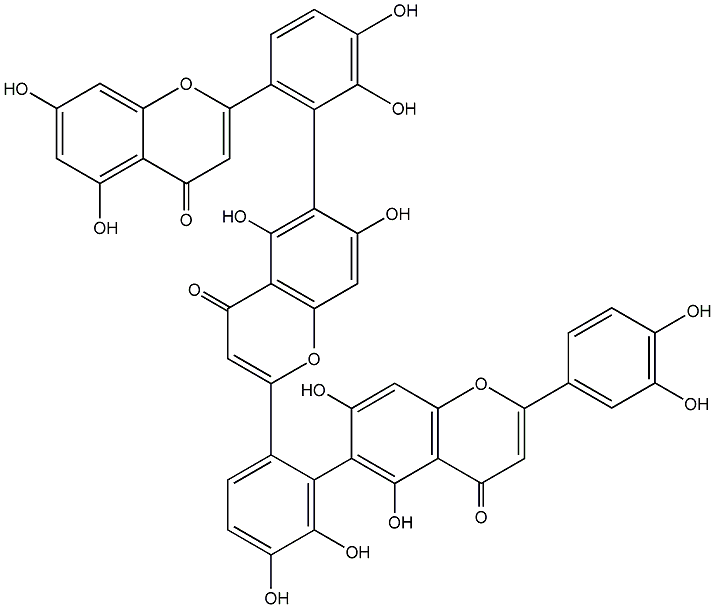97.01 | C00014752 | Distichumtriluteolin 6-[6-(5,7-Dihydroxy-4-oxo-4H-1-benzopyran-2-yl)-2,3-dihydroxyphenyl]-2-[2-[2-(3,4-dihydroxyphenyl)-5,7-dihydroxy-4-oxo-4H-1-benzopyran-6-yl]-3,4-dihydroxyphenyl]-5,7-dihydroxy-4H-1-benzopyran-4-one |