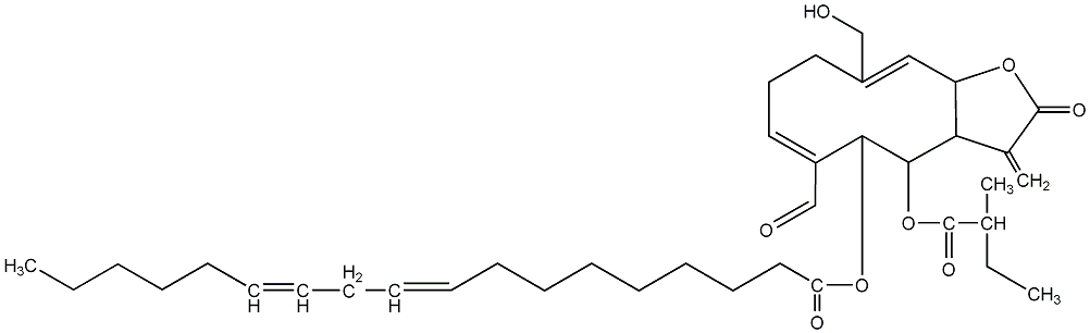 84.00 | C00012230 | 6-Formyl-2,3,3a,4,5,8,9,11a-octahydro-10-(hydroxymethyl)-3-methylene-4-(2-methyl-1-oxobutoxy)-2-oxocyclodeca[b]furan-5-yl ester octadecanoic acid | ![]() |