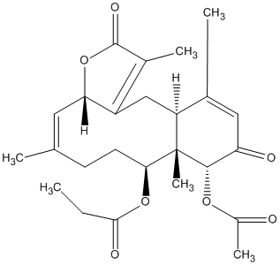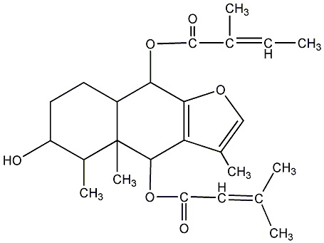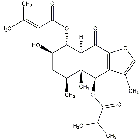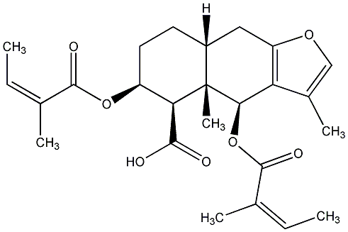 90.32 | C00017307 | [4S-[4alpha(Z),4aalpha,5alpha,6alpha(Z),8aalpha]]-4,4a,5,6,7,8,8a,9-Octahydro-3,4a-dimethyl-4,6-bis[(2-methyl-1-oxo-2-butenyl)oxy]-naphtho[2,3-b]furan-5-carboxylic acid | ![]() |
