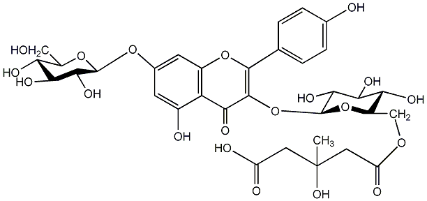 93.69 | C00005891 | Kaempferol 3-[6''-(3-hydroxy-3-methylglutaryl)glucoside]-7-glucoside 3-[[6-O-(4-Carboxy-3-hydroxy-3-methyl-1-oxobutyl)-beta-D-glucopyranosyl]oxy]-7-(beta-D-glucopyranosyloxy)-5-hydroxy-2-(4-hydroxyphenyl)-4H-1-benzopyran-4-one |