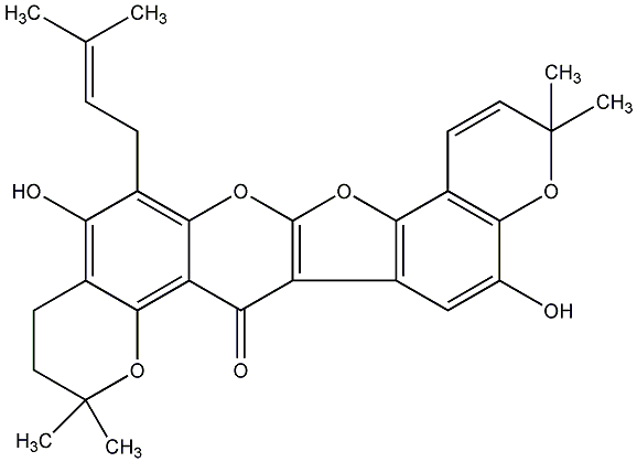 94.94 | C00019408 | Euchretin J 5,5'-Dihydroxy-8-prenyl-6'',6'',6''',6'''-tetramethyl-4'',5''-dihydropyrano[2'',3'':5,6]pyrano[2''',3''':4',3']coumaronochromone |