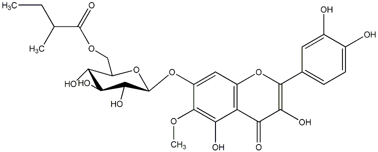 92.59 | C00013947 | Patuletin 7-[6''-(2-methylbutyryl)-glucoside] Quercetagetin 6-methyl ether 7-[6''-(2-methylbutyryl)-glucoside] 2-(3,4-Dihydroxyphenyl)-3,5-dihydroxy-6-methoxy-7-[[6-O-(2-methyl-1-oxobutyl)-beta-D-glucopyranosyl]oxy]-4H-1-benzopyran-4-one |
