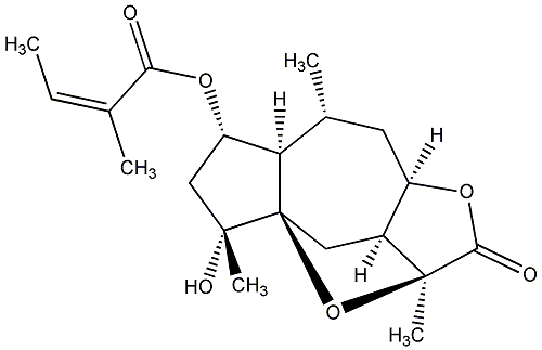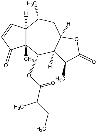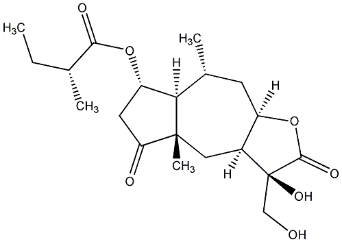 92.45 | C00020624 | [3aS-[3aalpha,7alpha(E),7abeta,8abeta,8balpha,8cbeta]]-2,3,3a,4,5,7,7a,8a,8b,8c-Decahydro-6,8a-dimethyl-3-methylene-2-oxooxireno[2,3]azuleno[4,5-b]furan-7-yl ester 2-methyl-2-butenoic acid | ![]() |